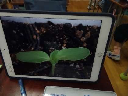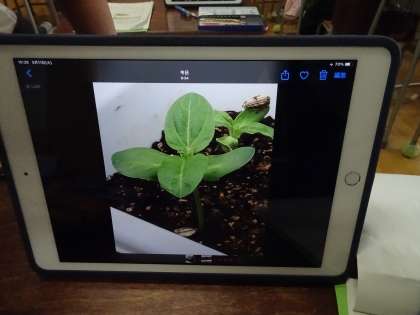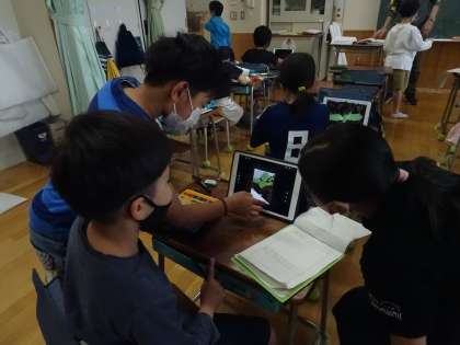 3年生は、タブレットで、成長の様子を撮影して、それをさらに観察して、カードに書いていました。アップにして見ると、細かいところもよく見えます。ルールを守って、しっかり観察できました。