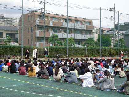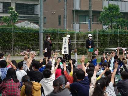 「ハンカチを持って避難できた人は手を挙げてください。」という校長先生の問いに、たくさんの人の手が挙がりました。日常的に、非常時には緊張感をもてることが大切です。先週より、ハンカチの忘れ物は減ったように見えました。教室に入るまでが避難訓練です。6年生が一言もしゃべらずに入室することで、全校が同じように集団行動をすることができました。