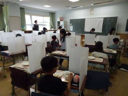 上級生になるほど、給食当番も慣れていきます。昨年度から使うパーテーションも、手早く片付ける習慣ができました。人のために働くこと、自分のことをしっかりできること、どちらも大切です。