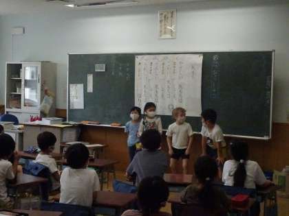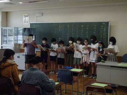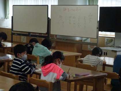 どんな詩を書こう。「雨上がりの気持ち」「虹が出た時」「緑が爽やか」「空が青い」「かえるがいた」いろいろな発見から、言葉が浮かんできました。素敵な詩ができたことでしょう。
