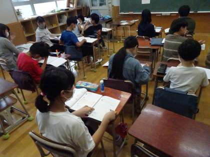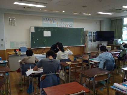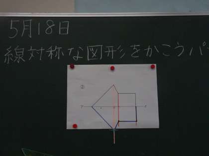 6年生は、線対称、点対称の図形の学習です。自力解決をするために、実際に図形を切って考えていました。