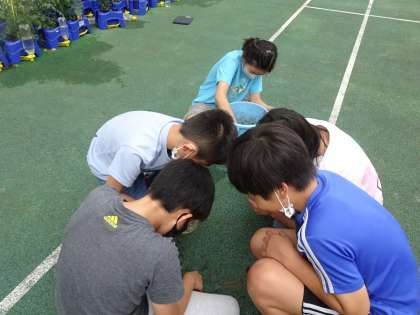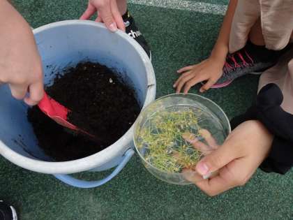 副校長先生に手ほどきをしていただき、小さな小さな種もみを植えました。ちょっと発芽が進んでいるので、葉っぱも出てきていました。皆で協力している姿が微笑ましかったです。