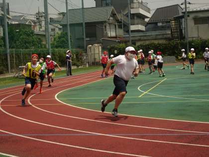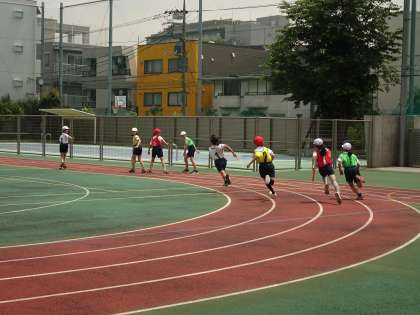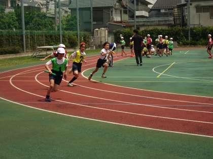 リレーの学習のまとめに入ります。チームごとに応援をしている姿が微笑ましかったです。ルールを守ること、全力で走ること、頑張りました。