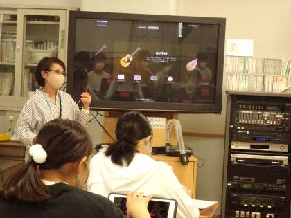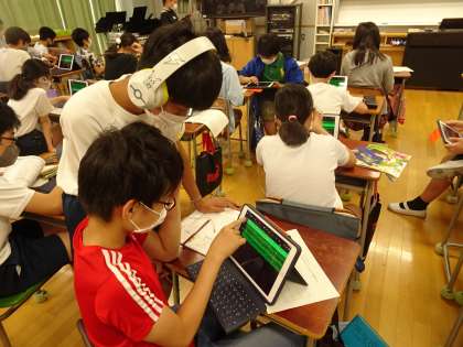 今日は、タブレット端末を使って、いろいろな楽器の音を選んで、演奏を創る学習でした。アンサンブルを創る人、多様な楽器の音を探る人、いろいろ試していました。本物の学期の演奏とどう違ってくるのか、ワクワクします。