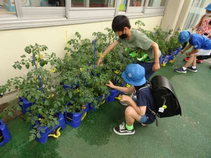3年生のミニトマト、4年生のへちま、2年生の朝顔、どんどん芽が大きくなってきました。水やりも忘れずに。5年生の米や、6年生のじゃがいもは、どうでしょうか。生き物は、毎日の世話がポイントです。