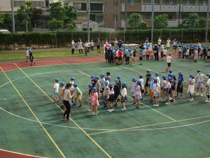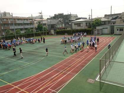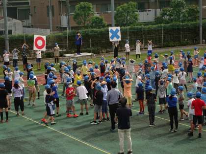 放送設備が不具合になり、行進の時の音楽が流れませんでした。すると、保健委員会の児童が、手拍子を始めました。その手拍子に合わせて、全校児童が順々に入室しました。ソーシャルディスタンスを守って行進できるようになりました。