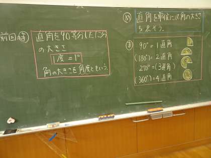 分度器の使い方を学びます。1直角、2直角、3直角・・・と感覚で覚えてから、角度の仕組を理解していきます。生活の中でも、直角のもの、たくさんありますね。