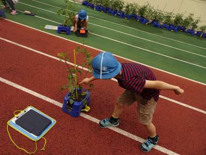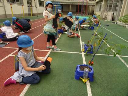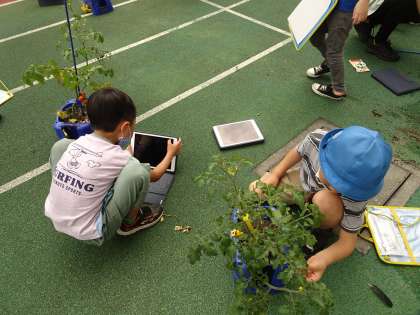 自分の鉢に、ミニトマトが53個もなっている人も。タブレット端末で、撮影しながら、観察カードもしっかり書いている2年生です。青いミニトマトが赤くなることに感動している姿が微笑ましいです。