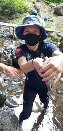 10分たってもなかなか鱒はつかまりません。みんな大騒ぎで、鱒を追いかけました。第一号は誰でしょう?