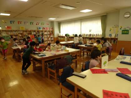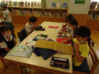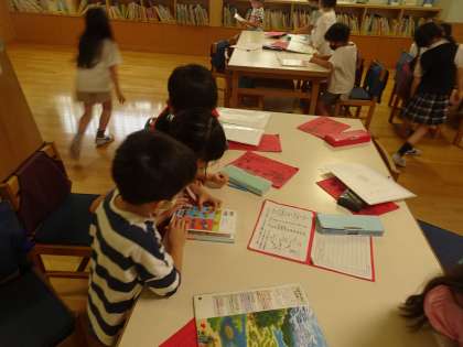1年生は、元気に挨拶をしてくれます。学校図書館で、いろいろな本を読んでいました。友達と情報交換をしている人もいます。