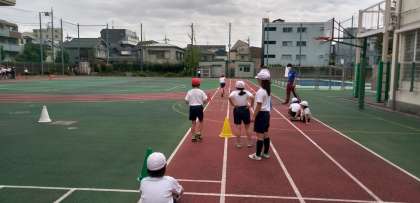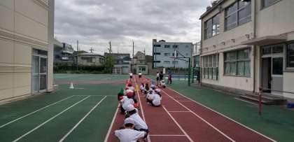 3年生は、ソーシャルディスタンスを守って、トラックを走っています。タイムも計りました。