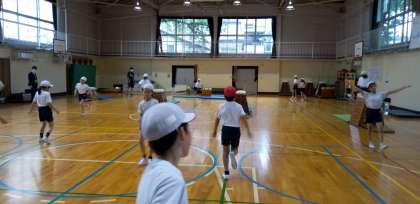 体育も貴重な時間です。次の人に合図を送る子どもたち。