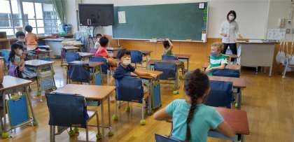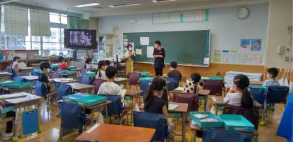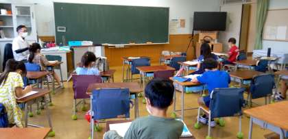 オンラインの人たちと挨拶を交わし、出席確認をしてから、モジュール学習をしています。15分で国語の言語学習をしています。今は、ファミリーグループはお休みです。