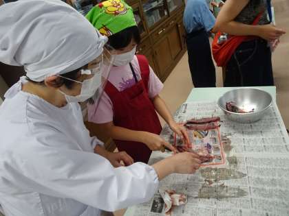 今年度も、感染症対策を徹底し、1クラスを3回に分けて実習をしました。社会科の学習として、島の暮らし、海産物、総合的な学習の時間として、魚を下ろす、理科の海の生き物の学習、家庭科のような技能の学習、いろいろな要素が入っています。