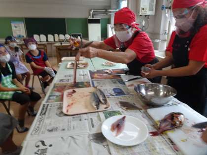 出刃包丁を、安全に使う方法を教えていただきました。「トミメ」「ムロアジ」「トビウオ」どれもピチピチしていました。初めて魚を触った人もたくさんいました。