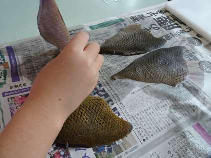 トミメの皮は、鉛筆も削れるそうです。触るとざらざらしています。魚の種類にも感動した子どもたち。初めての体験は、大きな学びになりました。感謝の言葉もしっかり言えました。帰りにあいさつをする姿も嬉しい気持ちになりました。