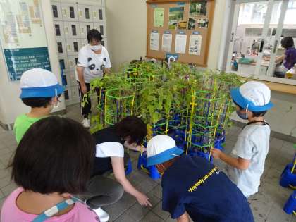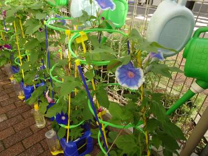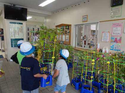 1年生の朝顔さんは、台風から鉢植えを守るために、協力して玄関まで運んでいました。頼もしい限りです。