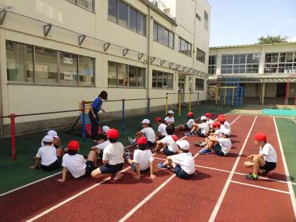 鉄棒運動です。逆上がりを練習しました。保育園の時からできている子、今からやる気を出して一生懸命取り組んでいる子、個人の目標に向かって頑張っていました。
