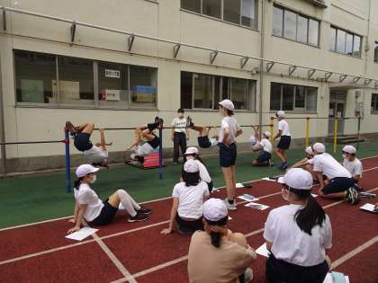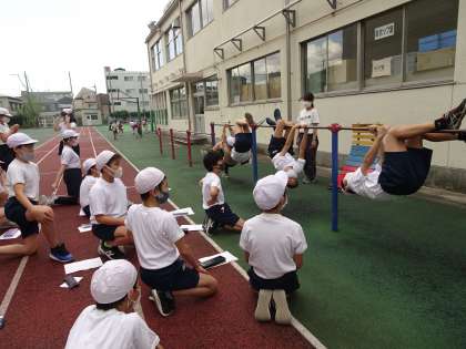 鉄棒にぶら下がりながらじゃんけんを楽しんでいました。体づくりの大切なことは、自分の身体を感じることです。重さも、回転の感じも、小さい時と今とでは感覚が違います。それが成長を感じることにもつながります。