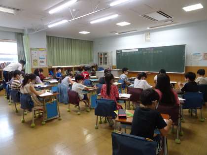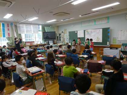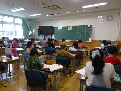 1年生は国語の音読発表会をしています。2年1組は国語「お手紙」、2年2組は算数をしています。