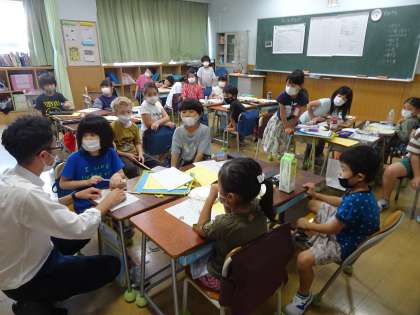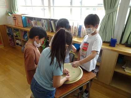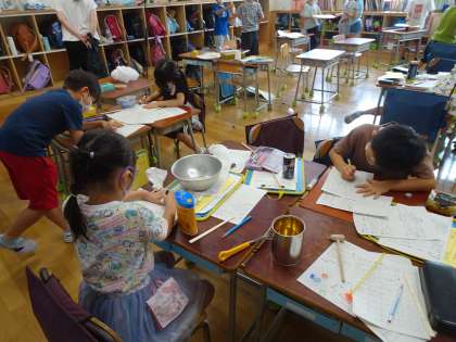 低学年と高学年は、ファミリーグループでの活動でした。低学年は、生活用品の中から音をたくさん創りました。たくさんの発見がありました。