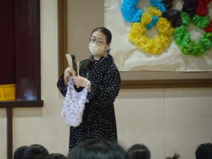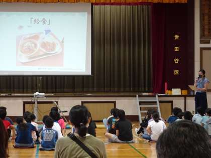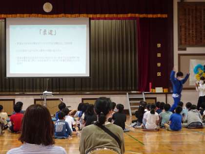 あいさつ、地形、気候、食育、料理、給食の歴史など、日本ならではの特徴を入れた発表になりました。舞踊は踊り、武道は柔道着を着て受け身の技を披露しました。書道はひらがなの歴史を紹介しました。料理は、おせち料理のことなども盛り込みました。