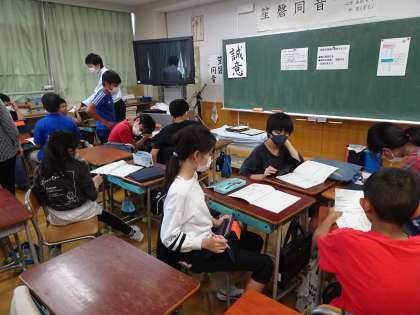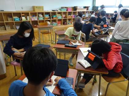 5年生、6年生は新しいグループができました。各グループ、話し合って、どの国の何を調べて、下学年に発表しようかと考えています。
