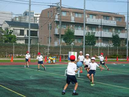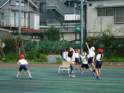 コートの真ん中の段ボールにボールを当てて崩すゲームです。作戦がものを言います。チームワークと、投げる力で、競うことを楽しんでいました。
