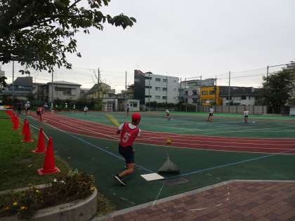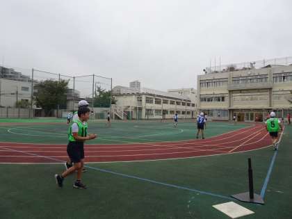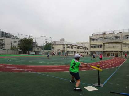 Tボールをしています。遠くに飛ばして点数をかせぐチームと、守りに徹して点数を押さえるチームがあります。声を掛け合って楽しんでいます。