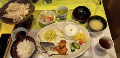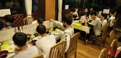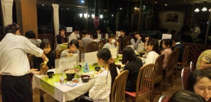 2日目の夕食は、このロッジでの最後の夕食。豚肉の陶板焼き、手作りの杏仁豆腐、ご飯と味噌汁。完食できた人ばかりでした。ロッジの方に感謝です。