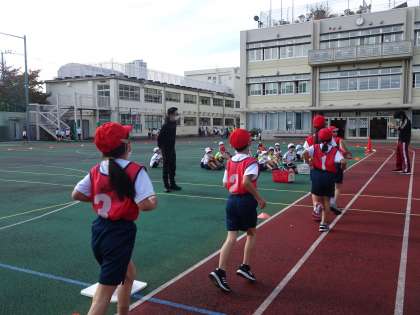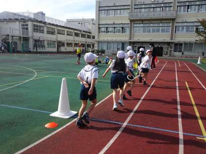 バトンを渡す練習は、トラックを走りながら、バトンのかわりの輪を渡して後ろに下がる動きから始まりました。
