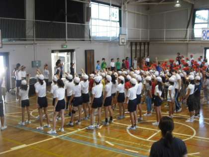 今日の音楽集会では、運動会で歌う歌の練習を行いました。赤も白も応援団の合図に合わせ、力いっぱい歌うことができました。