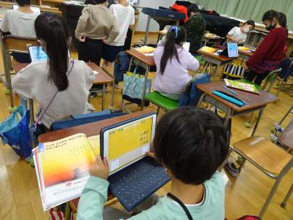 音楽は、「夕焼け小焼け」の歌詞をIPADに映して、情景をイメージしながら聴きました。夕焼けの写真がとてもきれいでした。