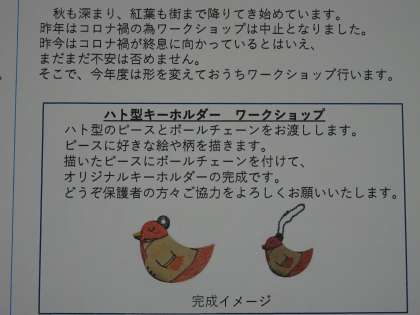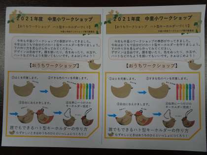 地域の方によるワークショップが、昨年度はできませんでした。今年度は工夫した形でご準備くださったキーホルダーづくりのキットをプレゼントしてくださいました。青少年委員、民生児童委員、主任児童委員、中里小学校協議会の方々が関わり、PTAの役員さんたちもお手伝いくださっています。