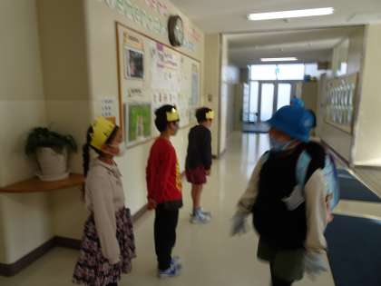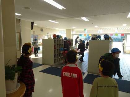 1年生が、あいさつのかんむりを頭に付けて、昇降口であいさつをしています。他学年の児童も元気にあいさつを返しています。嬉しい、微笑ましい光景です。