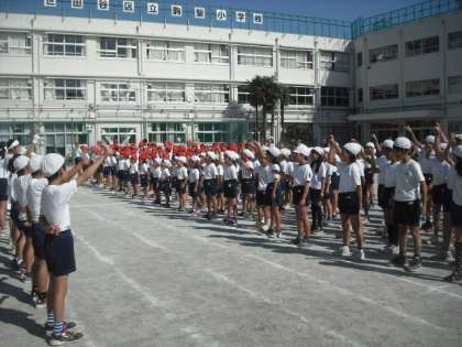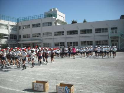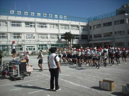 会場の駒繋小学校で、全校練習を行いました。晴天の中、場所の確認、声の大きさの確認をしました。