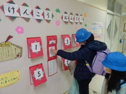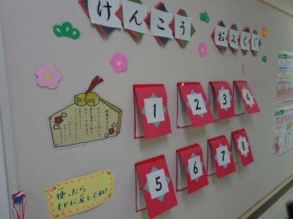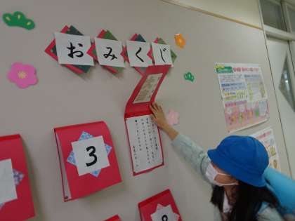 健康のためのおみくじです。子どもたちは、何度もひいては、大吉になったり、凶になったりと楽しんでいます。