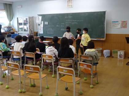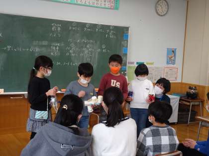 キラキラした顔で、自分の作った楽器を紹介する姿に感動した上学年の子どもたち。聞いてもらえてうれしいという体験は、豊かな心を育んでいます。