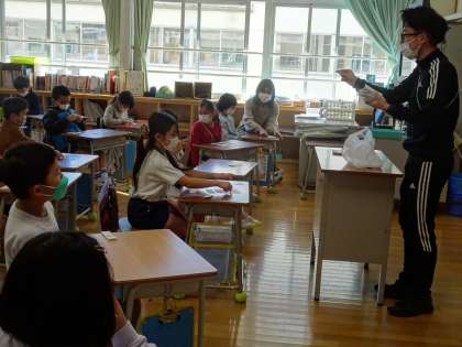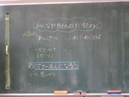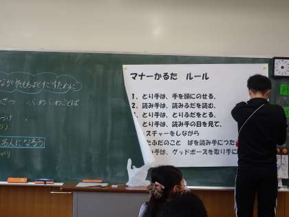 2年生は、みんなで気持ちよく過ごすために、「マナー名人になろう!」という授業をしています。マナーかるたを楽しむことで、気持ちのよい言葉を繰り返し使う習慣をつくろうとしています。