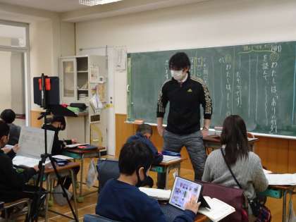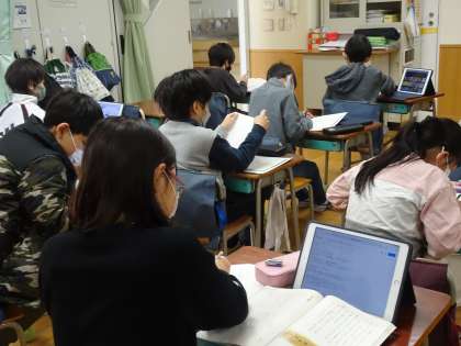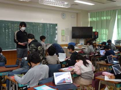 3年2組は、国語の勉強です。『ありの行列』の説明文の読み取りで、タブレットを使って調べたことをまとめる活動を取り入れていました。