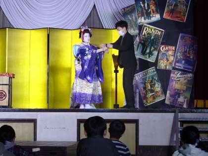 和妻 という伝統的な日本の手品を御存知でしたか。箱、和紙、こよりを使った芸術でした。格調高い言葉と衣装、道具の伝統を感じていた子どもたちです。