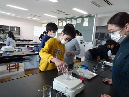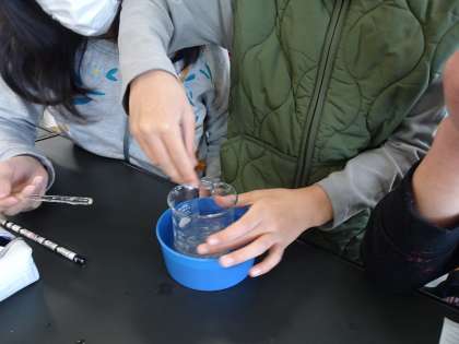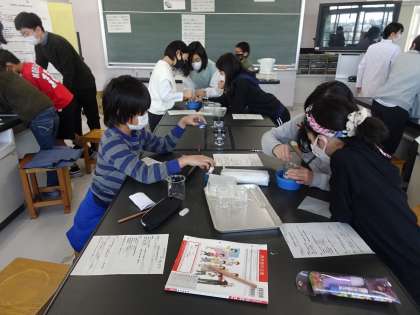 『化学反応を楽しもう』科学クラブで扱う内容を、授業で取り組みました。すまいるの教員が、通常級で挑戦しました。水溶液の性質の発展です。