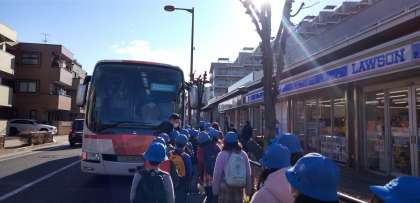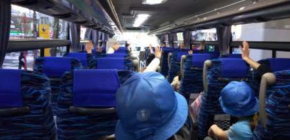 バス会社もコロナ感染対策をしっかりしてくださっています。消毒、換気も万全です。車中では、玉田先生による色のクイズを楽しんでいます。無言で手を挙げる子どもたちです。
