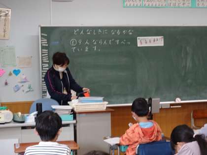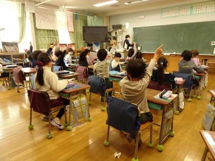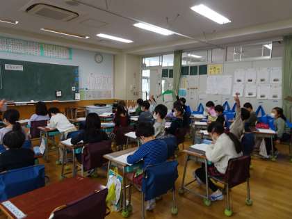 1年生の算数の授業風景です。前から4番目の子どものうしろには、何人いるでしょう、という問題。全部で9人いるので、どのように考えたらよいかをノートに書いて発表していました。