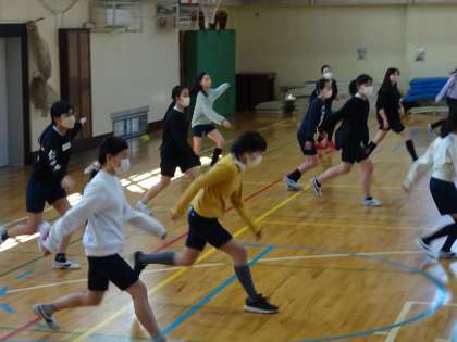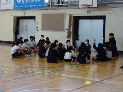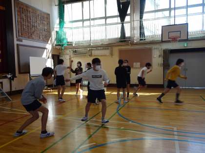 6年生は、ジャンケンゲームの後、身体能力テストのようなことをやっていただきました。単純なルールで楽しく体を動かしましたが、なかなか一つの目標を達成できません。失敗も皆で声をかけることで、楽しく転換しました。