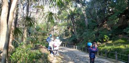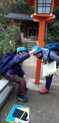 グループ行動でタブレットを使いながら協力している様子が見られます。気温は8度前後です。