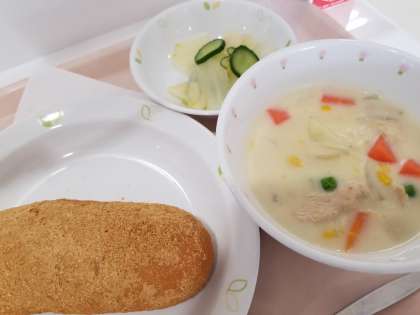 給食です。汁物も定番のクリームシチューとあわせ