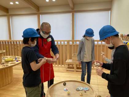 おもちゃ美術館では、普段見たことのない木の玩具に夢中な子どもたちです。裸足で木のぬくもりを感じている子どもたちもいます。
