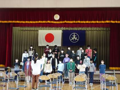 6年生だけの練習場面です。本番は、5年生の録音した合唱を6年生の生の合唱とかぶせます。緊張感を味わい、臨場感をもって録音できるように練習の場を工夫しました。