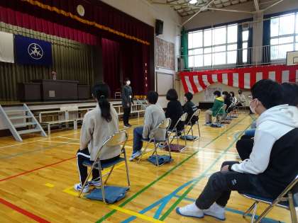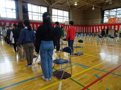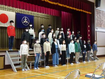 入退場の曲は、『威風堂々』5年生のリコーダーを録音したものを流します。『旅立ちの日に』は、パートを分けて5年生と6年生が歌います。5年生の録音の声と6年生の声がハーモニーを醸し出しました。最後に、元担任の先生からの指導講評がありました。